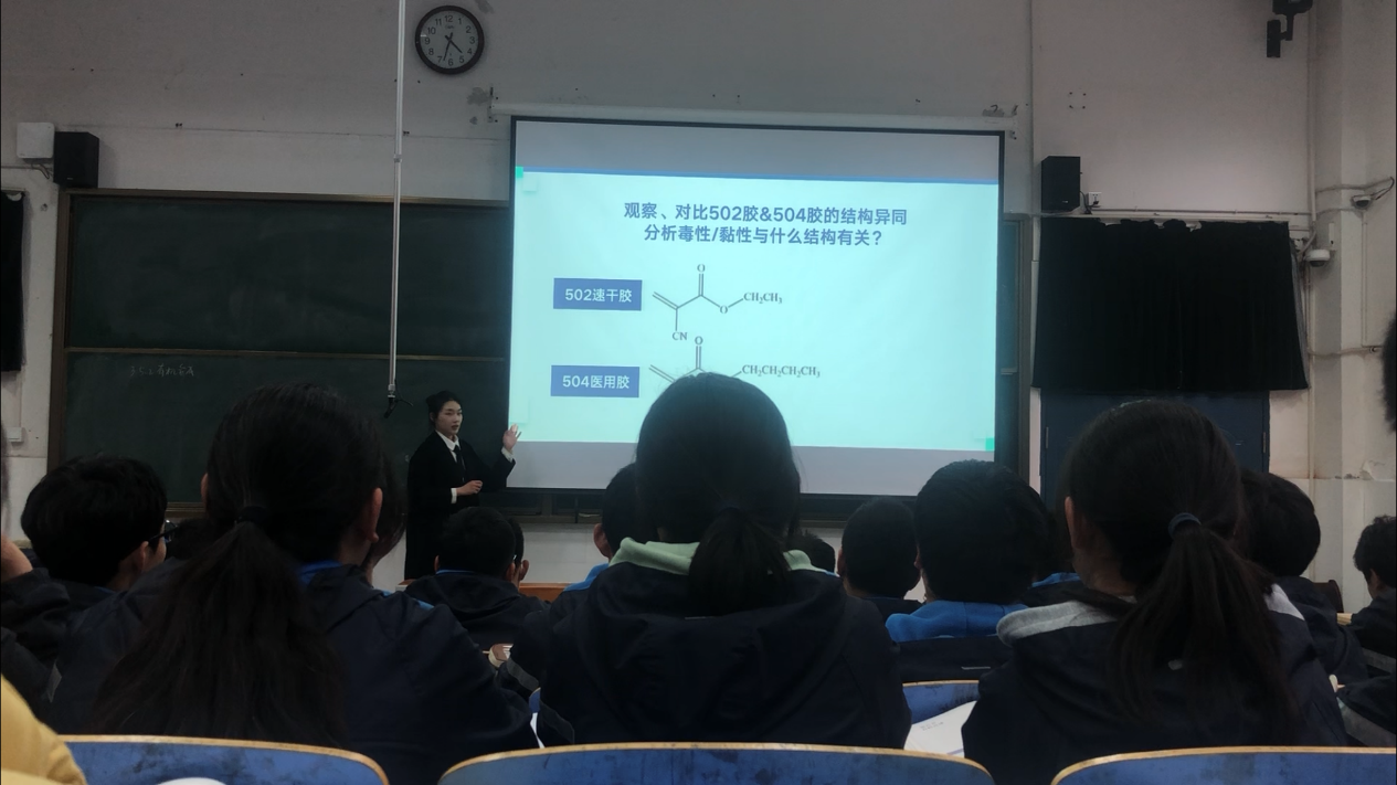 2020级实习生李昱璇讲授人教版高中化学教材选择性必修三,第三章第五节《有机合成》第二课时。李昱璇从504医用胶入手,以性能→性质→结构片段→设计分子→修正→产品的程序和思路展开本节课,利用两个核心问题“以乙烯为原料设计正丁醇的合成路线”、“以乙烯为原料设计氰基乙酸正丁酯的合成路线” 帮助学生实现正向建模和逆向建模两种思维模型。通过对医用胶结构与性能关系的探究,应用有机化合物性质分析解释实际现象,巩固学生认识有机物的基本角度;通过合成504医用胶的主要成分这一项目式学习,发展学生运用结构-性质-性能三者关系解决实际问题的能力,会结合生产实际选择适当的合成路线,认识创造一定性能产品的程序,感受化学学科的学科价值;通过问题探究的教学方法,帮助学生掌握烃及烃的衍生物性质及官能团间的相互转化,了解有机合成的基本过程和基本原则。学生在本节课能体验科学家们的研发思路,并认识到模型是解决复杂有机问题的根本,能帮助学生体会化学在认识材料的组成和性能方面的重要意义。