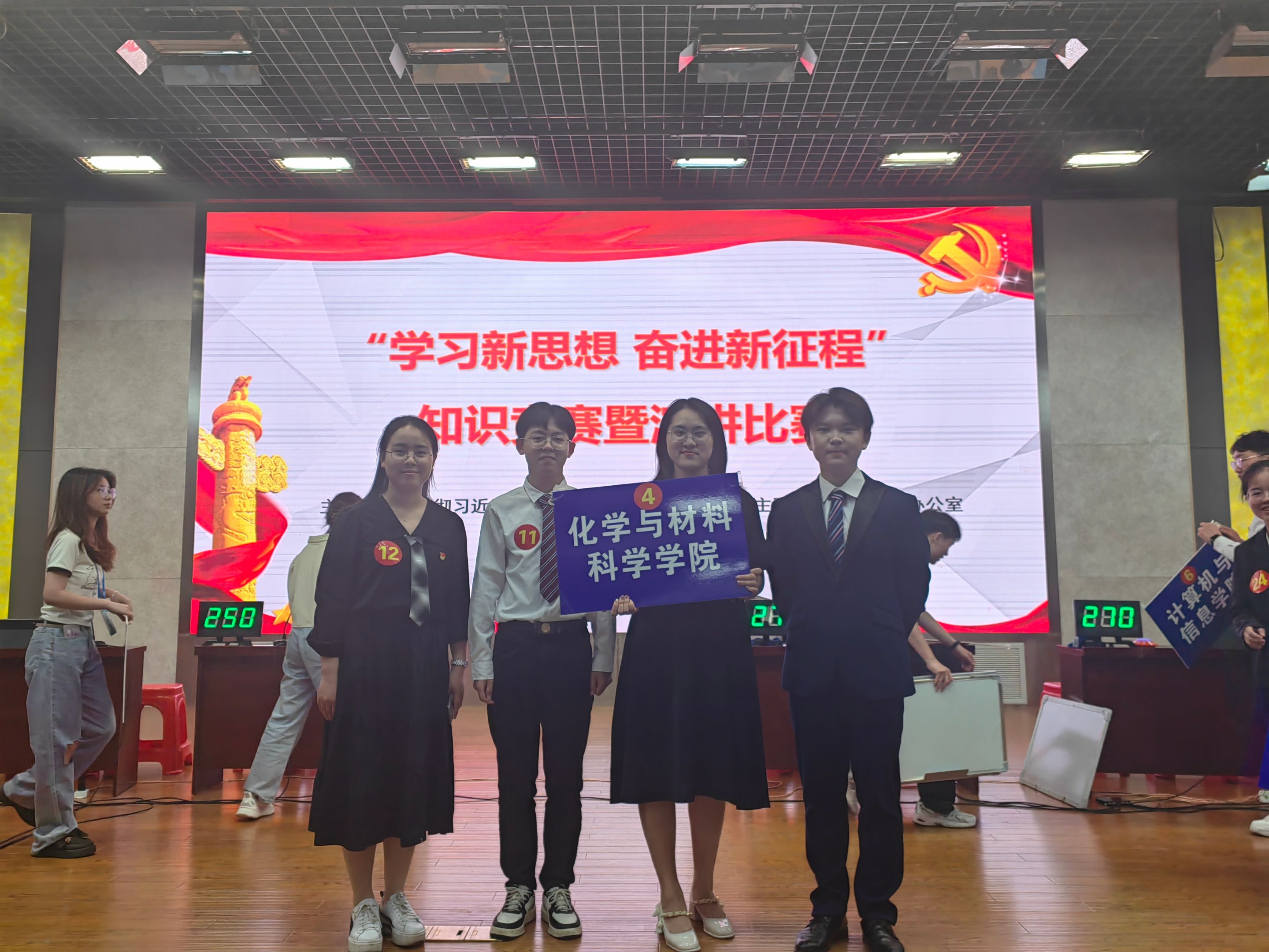 2022级化学师范专业杜旻展同学在演讲比赛中荣获一等奖,2019级应用化学专业吴泓婧、2020级应用化学专业朱会凌、2021级材料化学专业梅雨在知识竞赛中荣获二等奖。