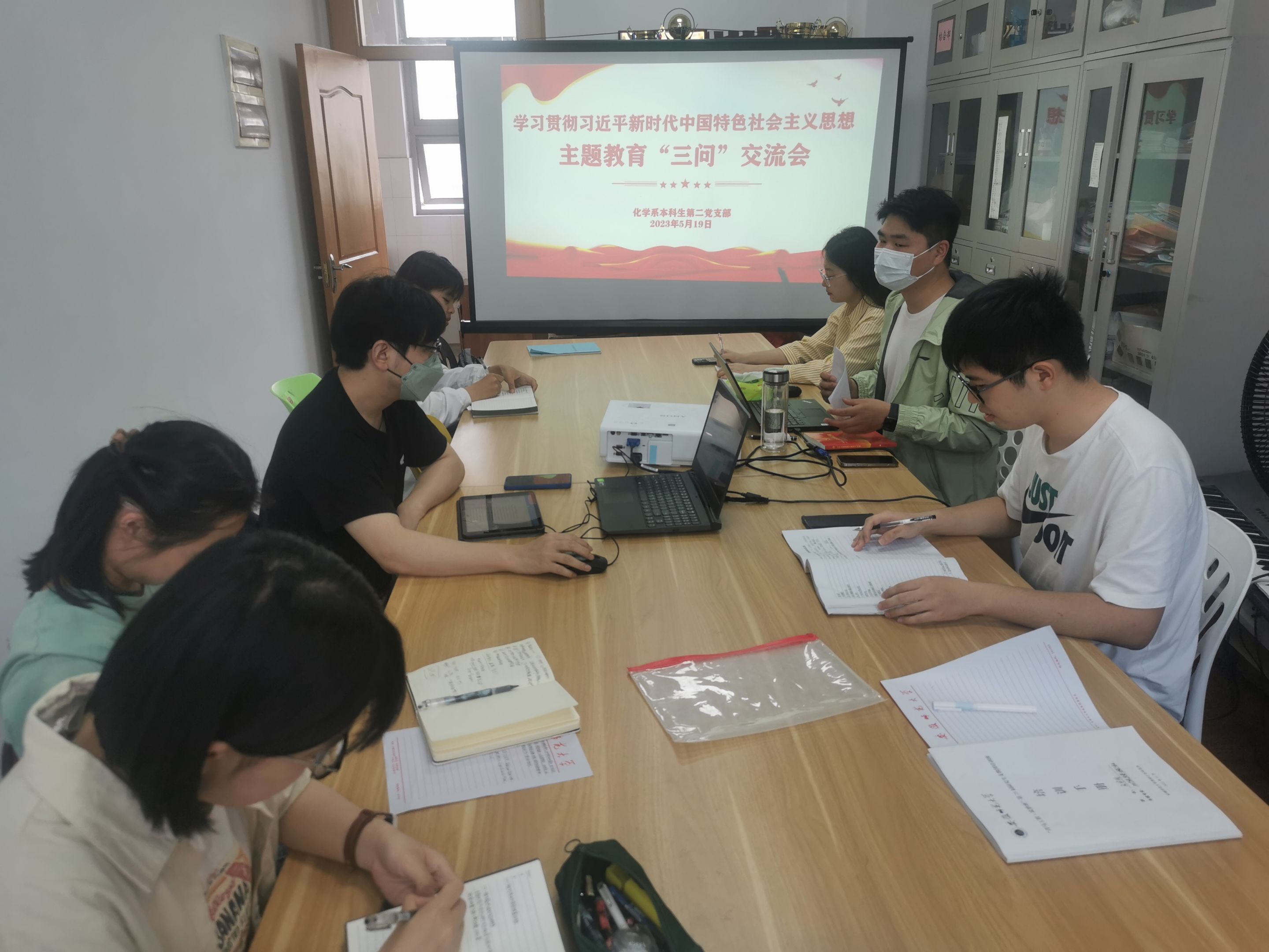 王宇阳、陶勇)为深入开展学习贯彻习近平新时代中国特色社会主义思想主题教育,5月19日下午,化学系本科生第二党支部在9号楼307会议室召开了“三问”交流会,支部全体党员通过线上线下结合的方式参加会议,会议由支部书记陶勇主持。