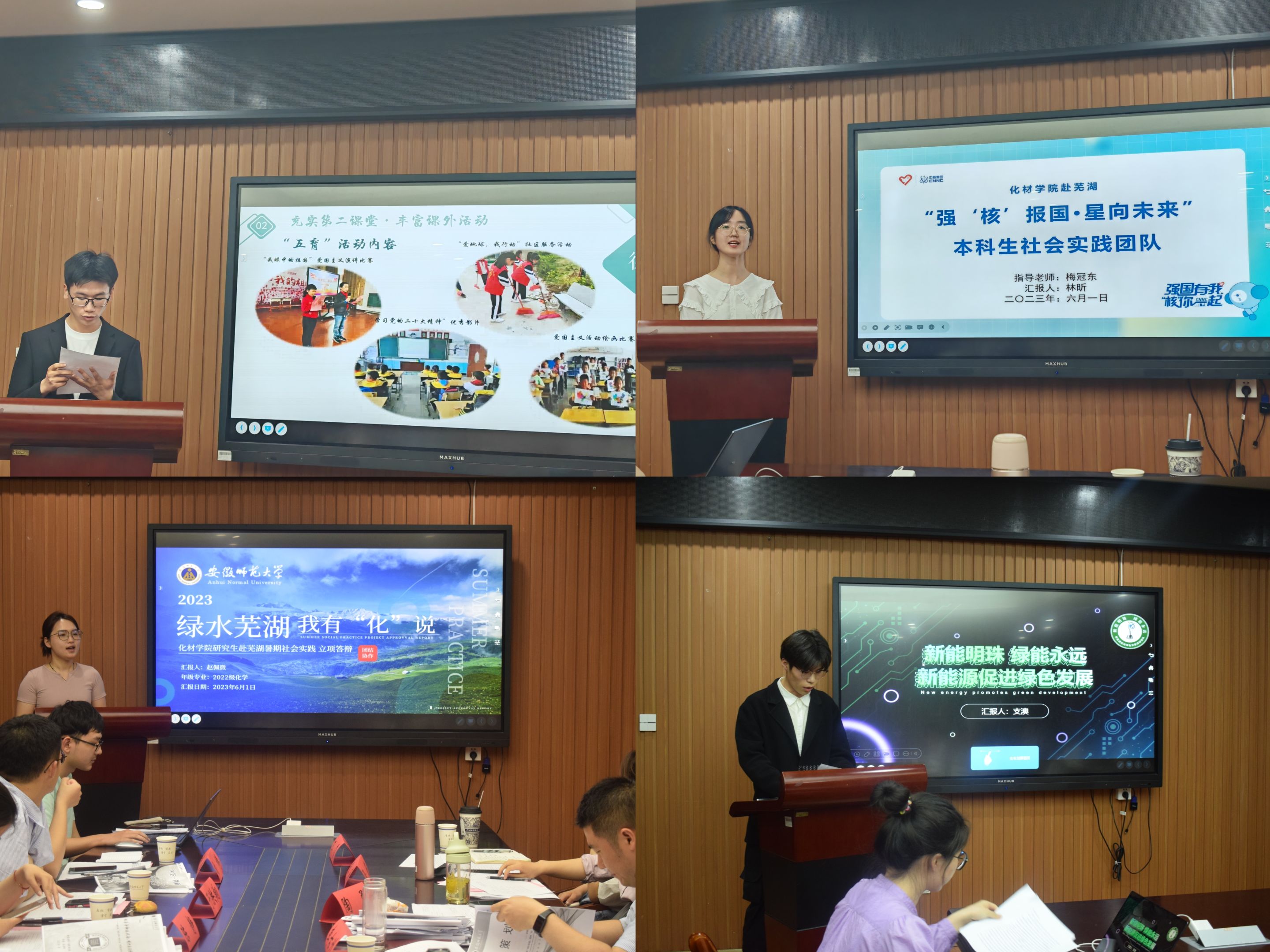 本次答辩会共有29支团队参与,根据实践主题分为先锋化材、奉献化材、学术化材、创新化材。各团队选题丰富,涵盖红色宣讲、科普支教、社会调研、乡村振兴、水质调研等多个层面,并结合国情和新出台的相关政策,关注时下热点问题,策划了一系列的实践活动。每个团队均有对应的指导老师,为实践活动的开展提供意见。答辩会上,29名学生代表分别就各自实践团队项目进行了展示和讲解,他们分别从不同的角度出发,运用不同的方法,介绍各自团队的实践方案。其中,“绿水芜湖,我有‘化’说”社会实践团从实践地的实际情况出发,分析了芜湖当地生态环境保护存在的问题,并提出了可行性建议;“守艺·创新”大学生非遗调研团队成员从文化遗产保护角度出发,在实地考察和文献资料收集的基础上,对当地的文化遗产保护方案进行了系统性的梳理并提出合理化建议;绿帽奴