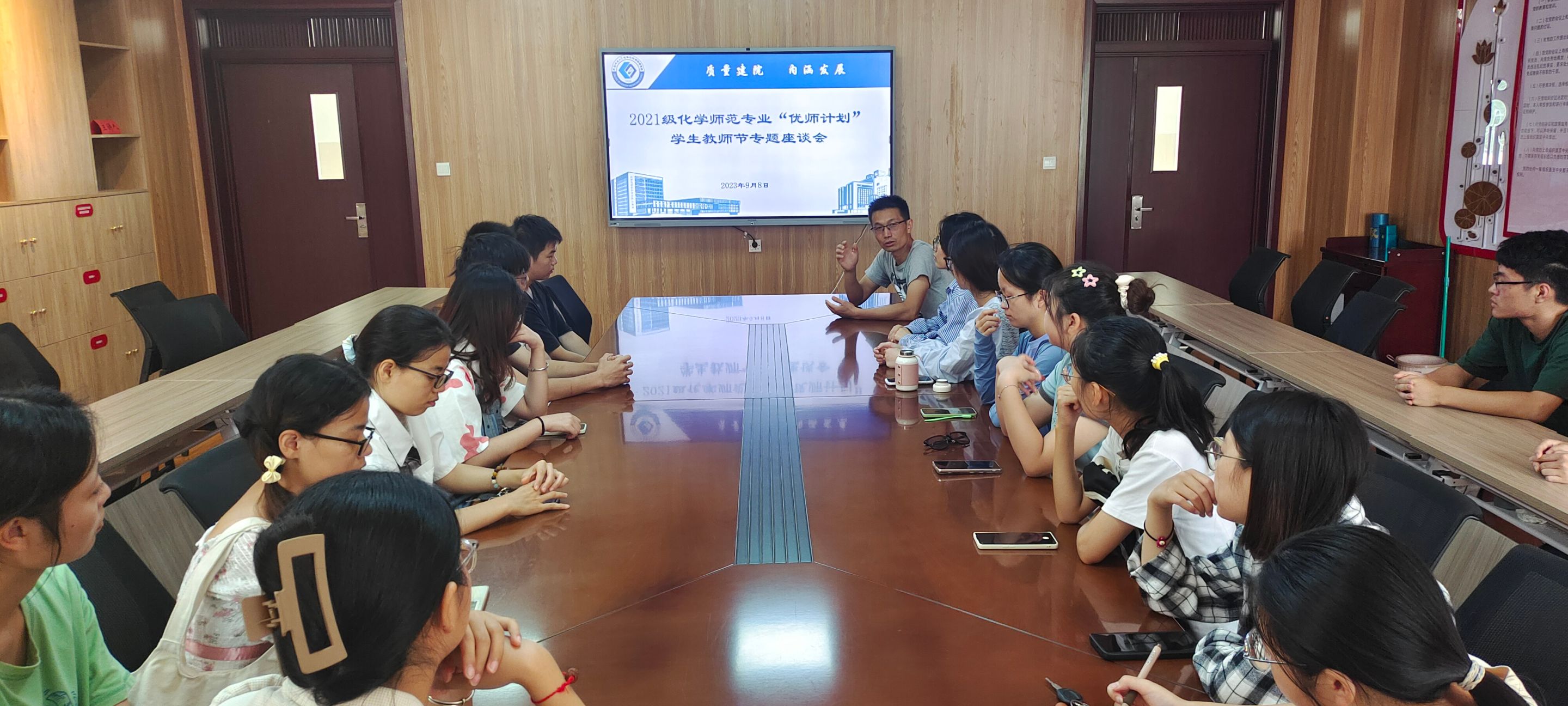 在礼勤楼707会议室组织召开了2021级化学“优师计划”学生专题座谈会。本次座谈会邀请了化学教学论方向教师阙荣辉作指导教师,2021级“优师计划”专业全体同学参加了本次会议。