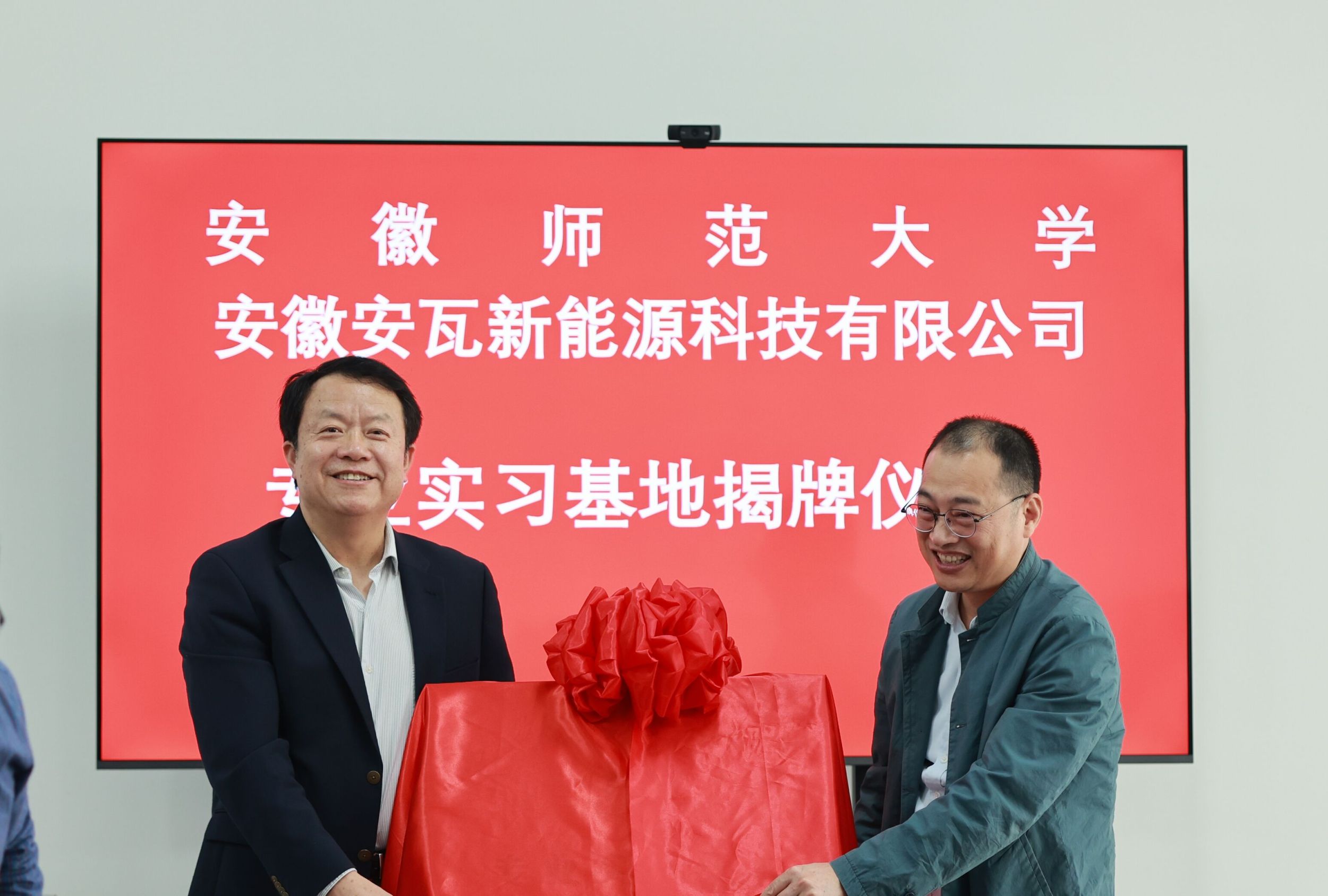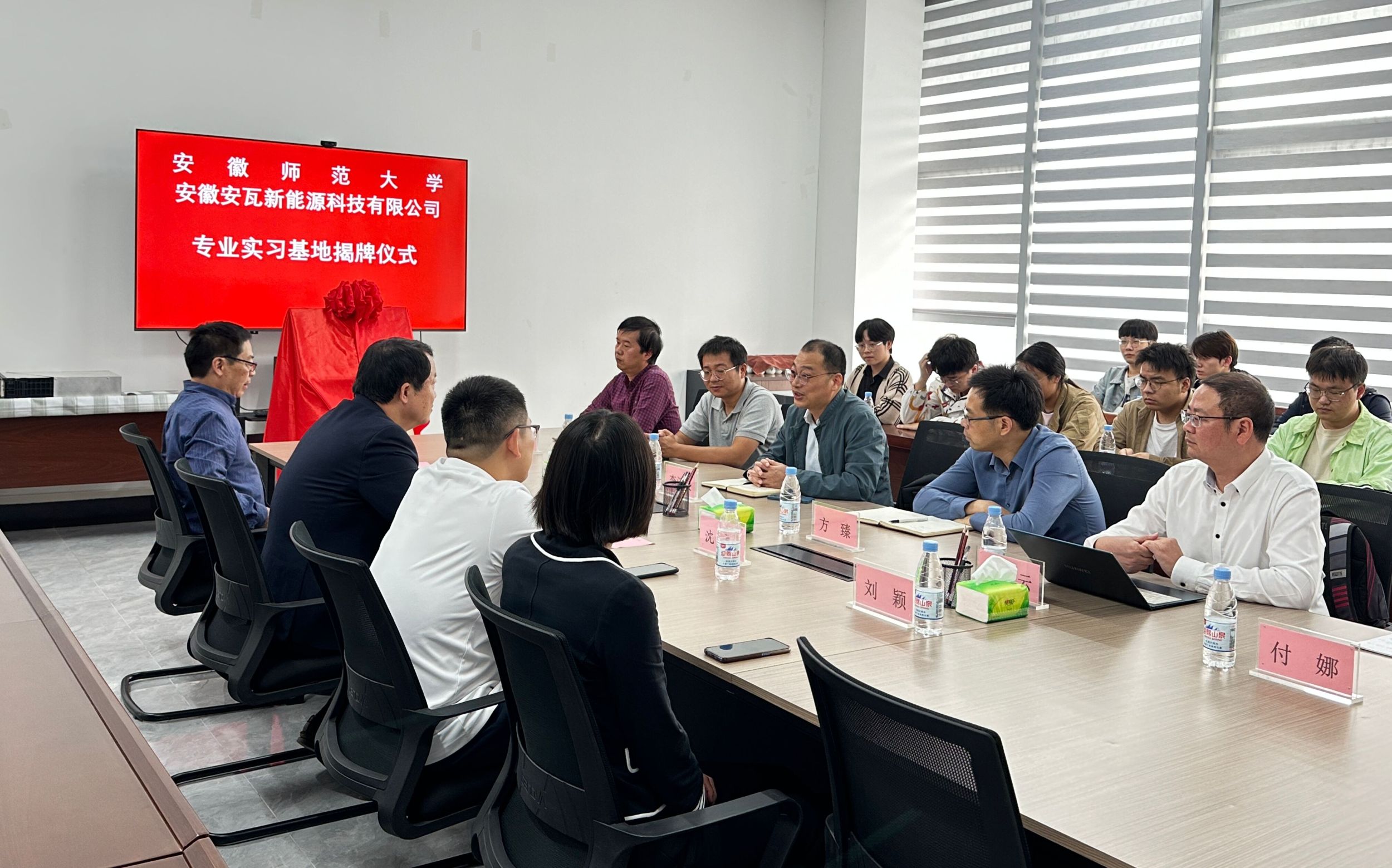 于安徽安瓦新能源有限公司会议室举行专业实习基地揭牌仪式。安瓦新能源有限公司常务副总经理张志伟、副总经理曹建齐、副总经理沈赟、IT与流程部总监刘颖,绿帽奴