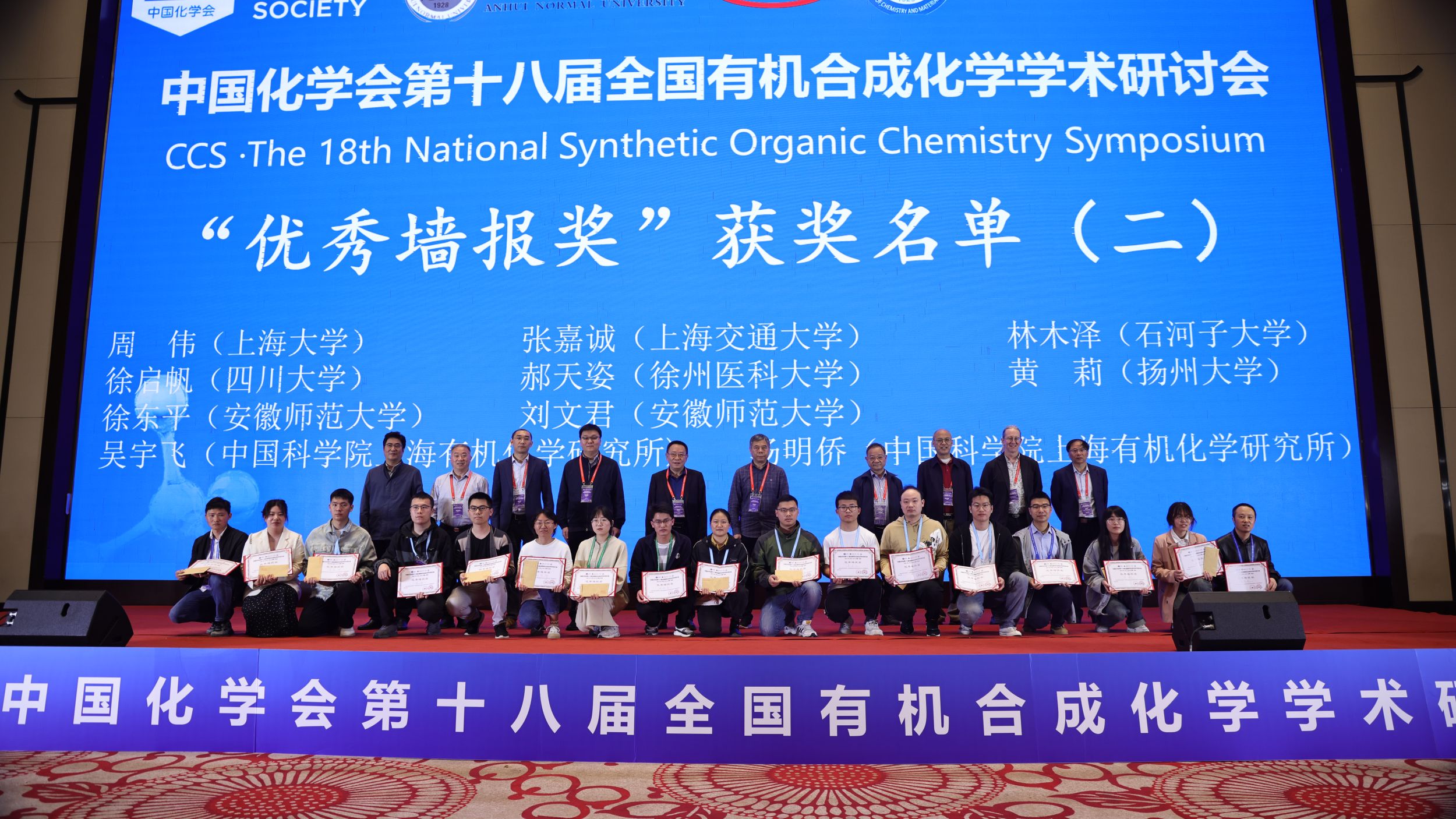 /中国科技大学教授王官武主持闭幕式,高峰教授宣读了中国化学会第十八届全国有机合成化学学术研讨会“优秀墙报奖”获得者名单,并与Patrick J.Walsh教授、黄培强教授、叶新山教授、舒兴中教授、赵刚研究员、南开大学陈永胜教授、西南大学周成合教授、苏州大学姚英明教授、重庆大学闫海龙教授为20名“优秀墙报奖”获得者颁奖。