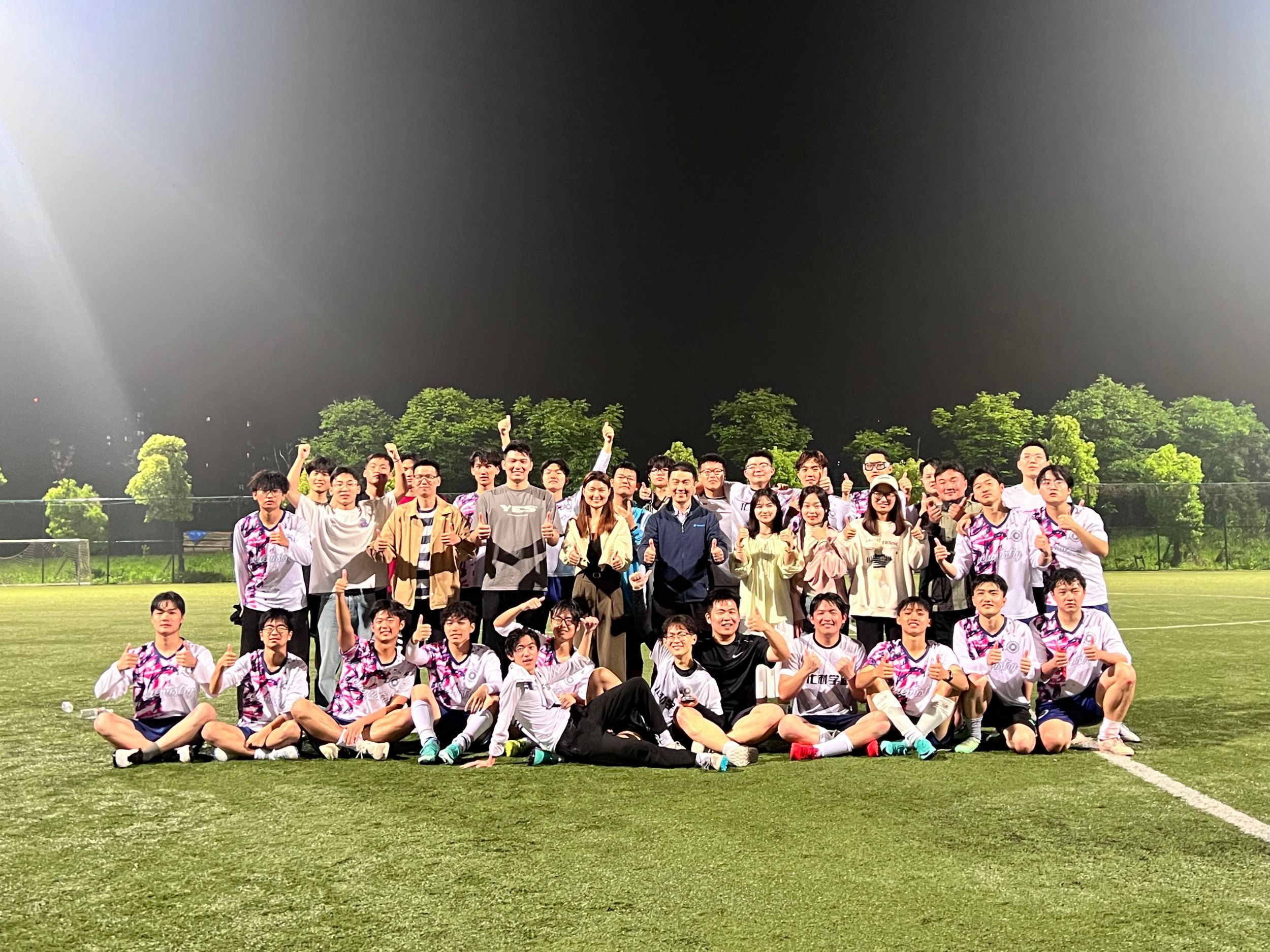 党委副书记李古州、团委书记梅冠东、辅导员王霞、梁成、付娜、朱梦茹、朱文棋到球场观看比赛,为球员加油助威。