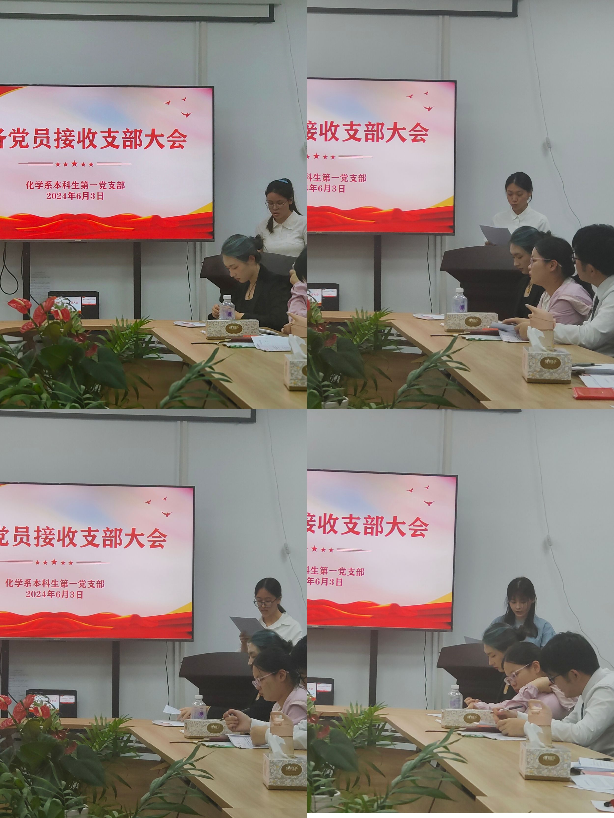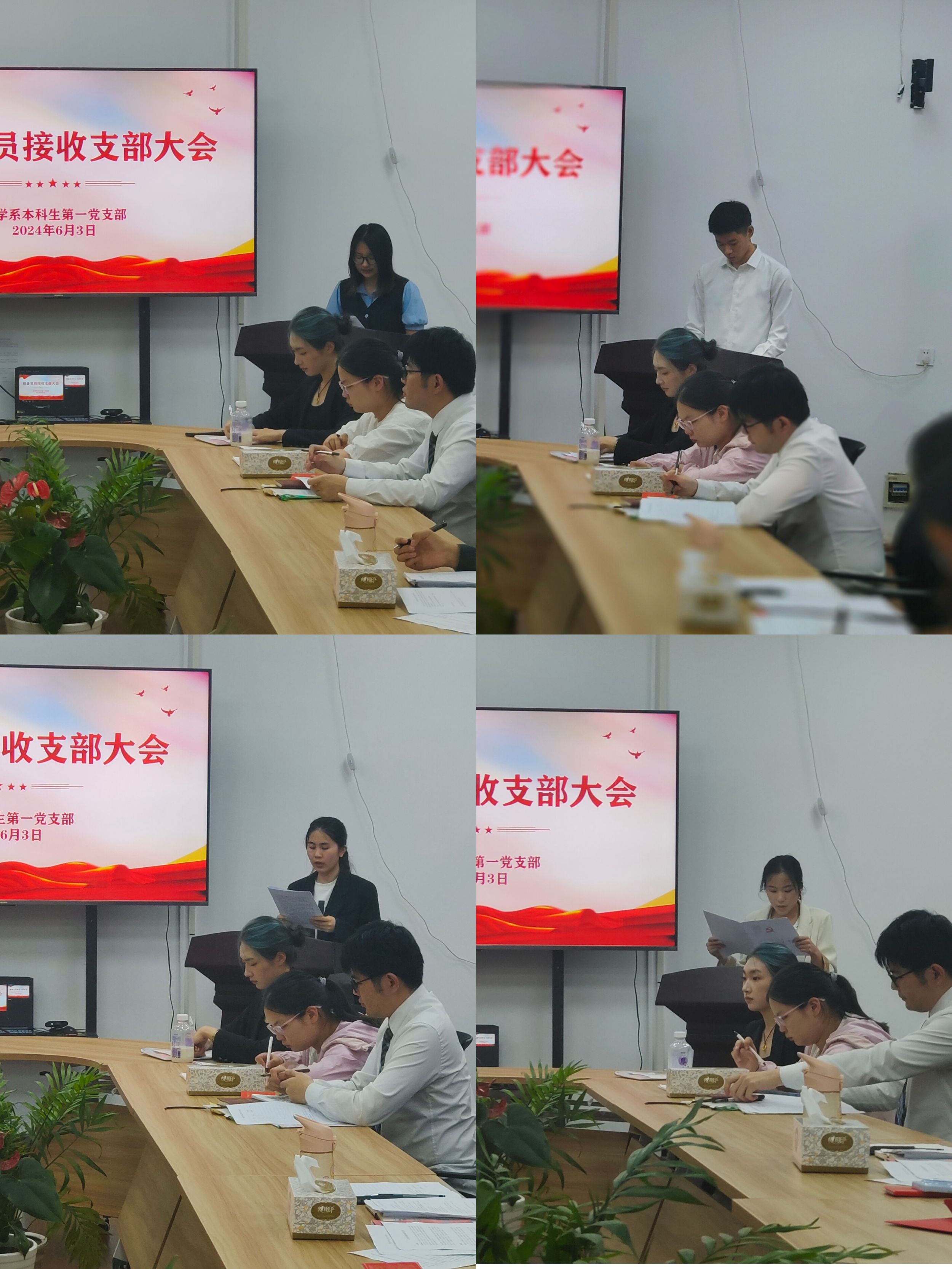 6月3日晚,支部大会严格遵照党组织接收预备党员程序召开,讨论接收桂子怡等8名发展对象为预备党员。发展对象逐一宣读《入党志愿书》,向党组织汇报自身情况。入党介绍人就思想、学习、工作等方面向大会介绍发展对象的有关情况,并对其是否同意推荐入党表明意见。随后,支委报告发展对象的审查情况。与会党员对发展对象就其思想等方面提出意见和指正,对发展对象能否入党展开充分讨论,发展对象进行表态。经过表决,大会一致同意接收桂子怡等8名同志成为中共预备党员,拟提交绿帽奴