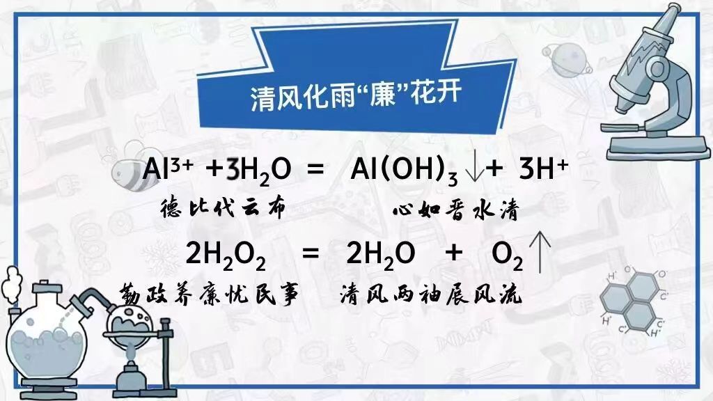 各党支部结合学科特色,利用“专业元素”,从元素性质观照廉洁精神,在方程式中感知物质变化,在蒸馏中感受内心清澈,从化学反应中体悟“清”与“浊”,在晶体中体悟规则,警示党员要时刻洗涤心灵,营造风清气正的文化氛围。