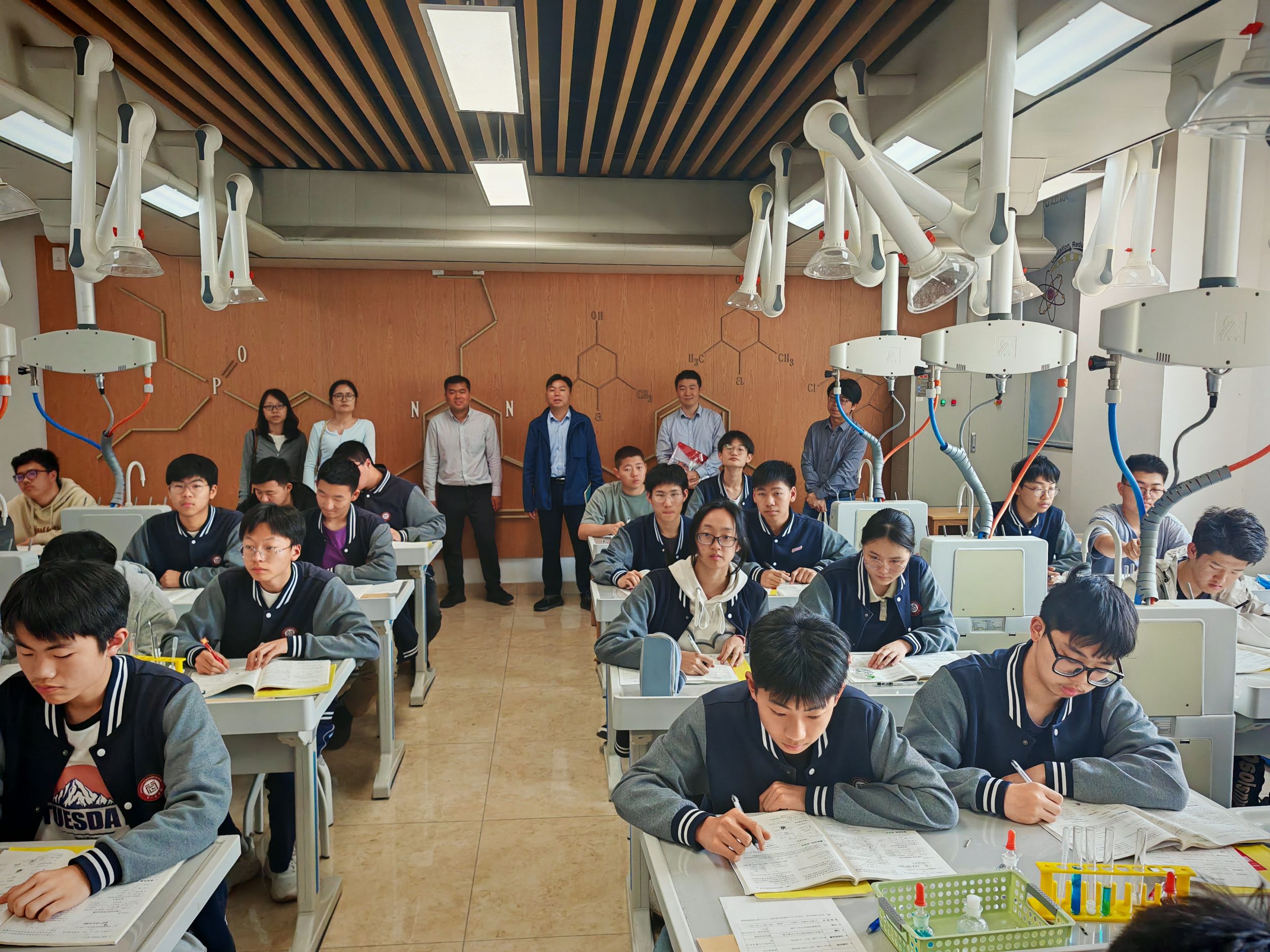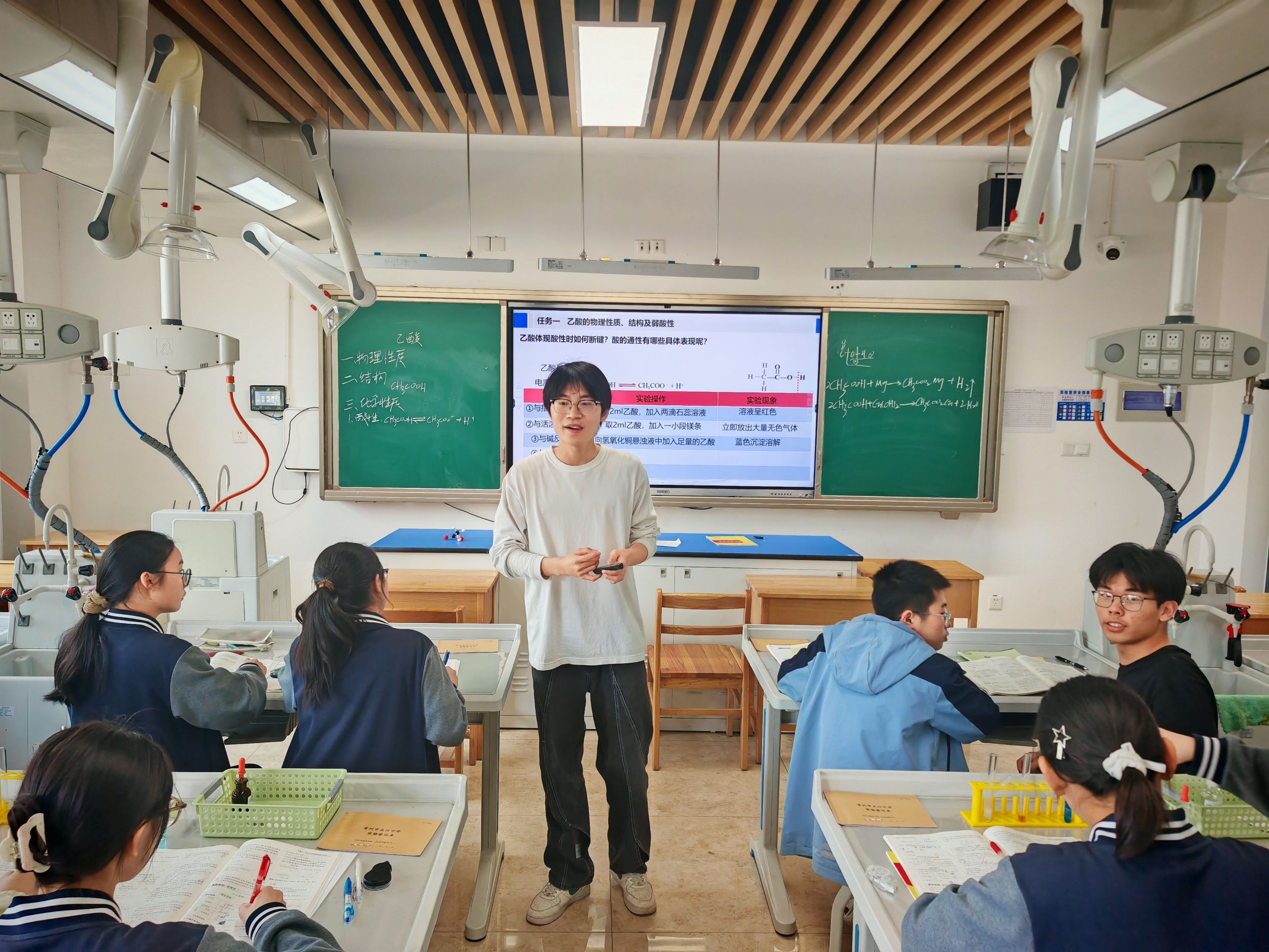 调研组首先与正行中学校长高东梅、副校长蒋建兵、胡爱彬、党政办公室副主任黄刚及全体实习生展开座谈。实习生分别汇报了个人教学实践、班级管理、教研活动的收获,坦言“从学生到教师的角色转换充满挑战,但导师的悉心指导让自己快速成长”。崔鹏副院长勉励实习生:要珍惜一线教学机会,主动参与集体备课、教学研讨,在反思中提升课堂驾驭能力。随后,走进实习生课堂,观摩了2022级化学(师范)专业本科生张朕翔的公开课。张朕翔通过生活实例导入课程,借助多媒体动画演示反应机理,引导学生分组实验探究影响因素,课堂设计逻辑清晰、互动活跃。