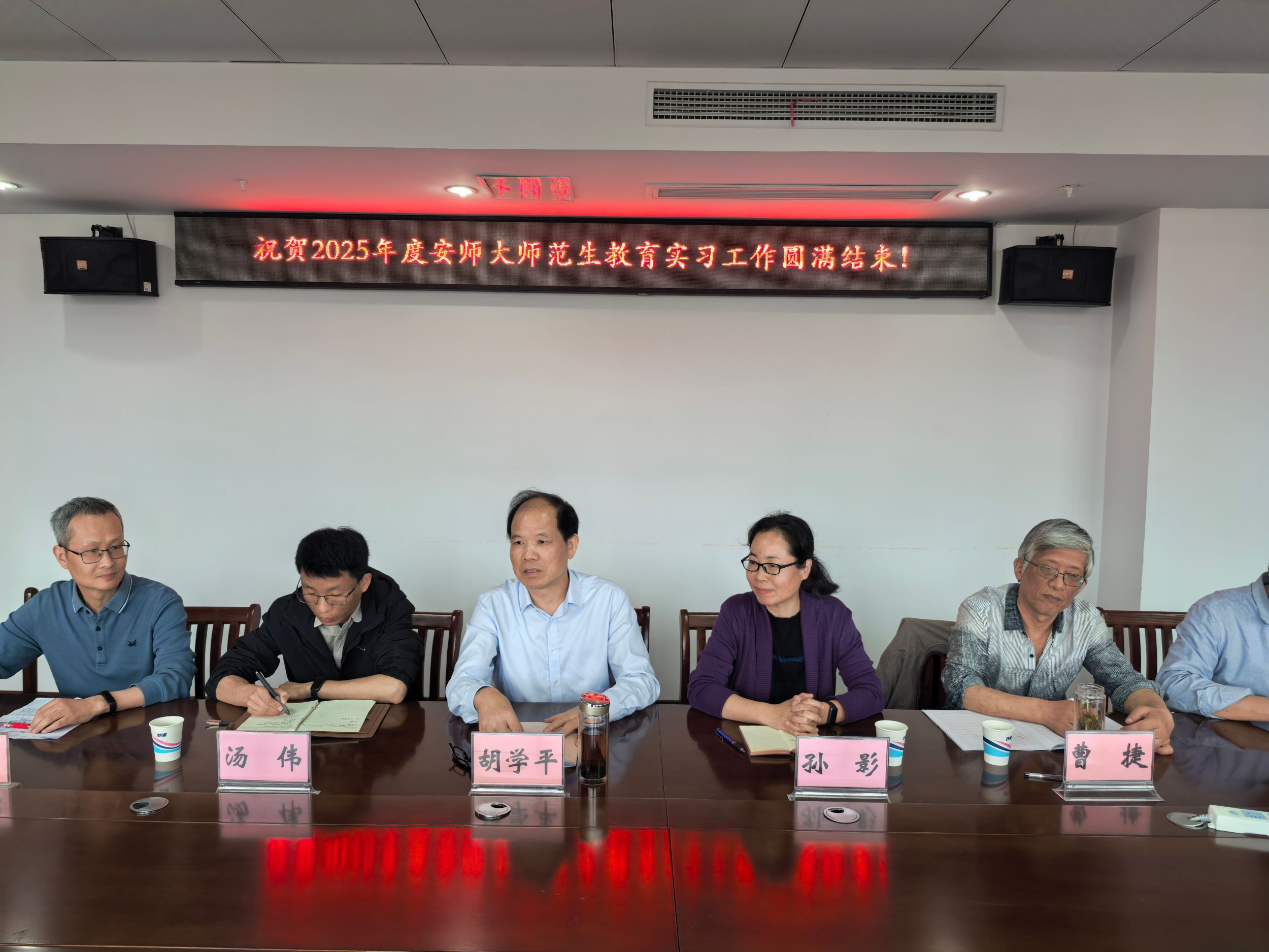 实习指导教师孙影老师、马鞍山二十二中校领导、中学化学名师工作室主持人,正高级教师后勇军老师、实习团队及中学指导教师齐聚六楼会议室,共同见证实习生们的成长与收获。会议由周美华老师主持,现场气氛热烈,充满温情与期许。活动分为三大环节: