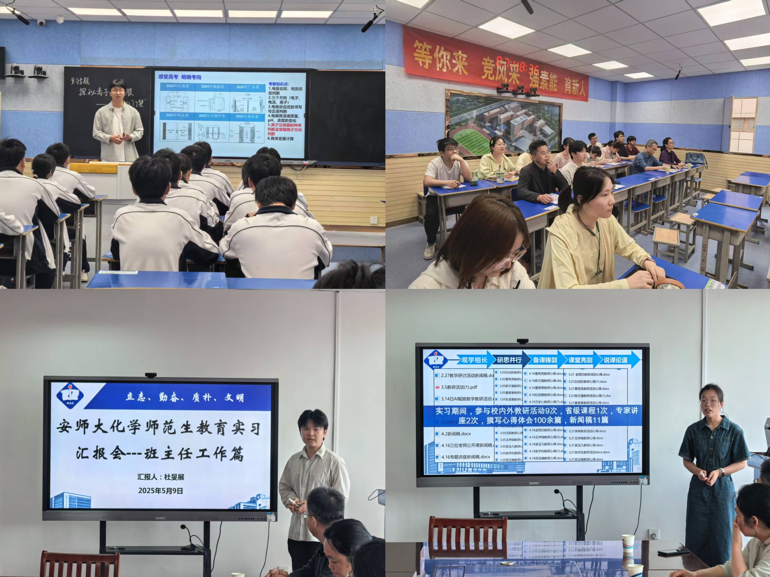 实习生代表董景景则聚焦“教学与教研”从听课学习、备课研讨、课堂实践、教研活动及说课比赛五个维度进行汇报,讲述了团队成员从“新手”到“站稳讲台”的蜕变历程。她特别提到,在指导教师的帮助下,团队成员教学设计能力与课堂应变能力显著提升,在马鞍山二十二中实习经历是团队成员成长道路上浓墨重彩的一笔。