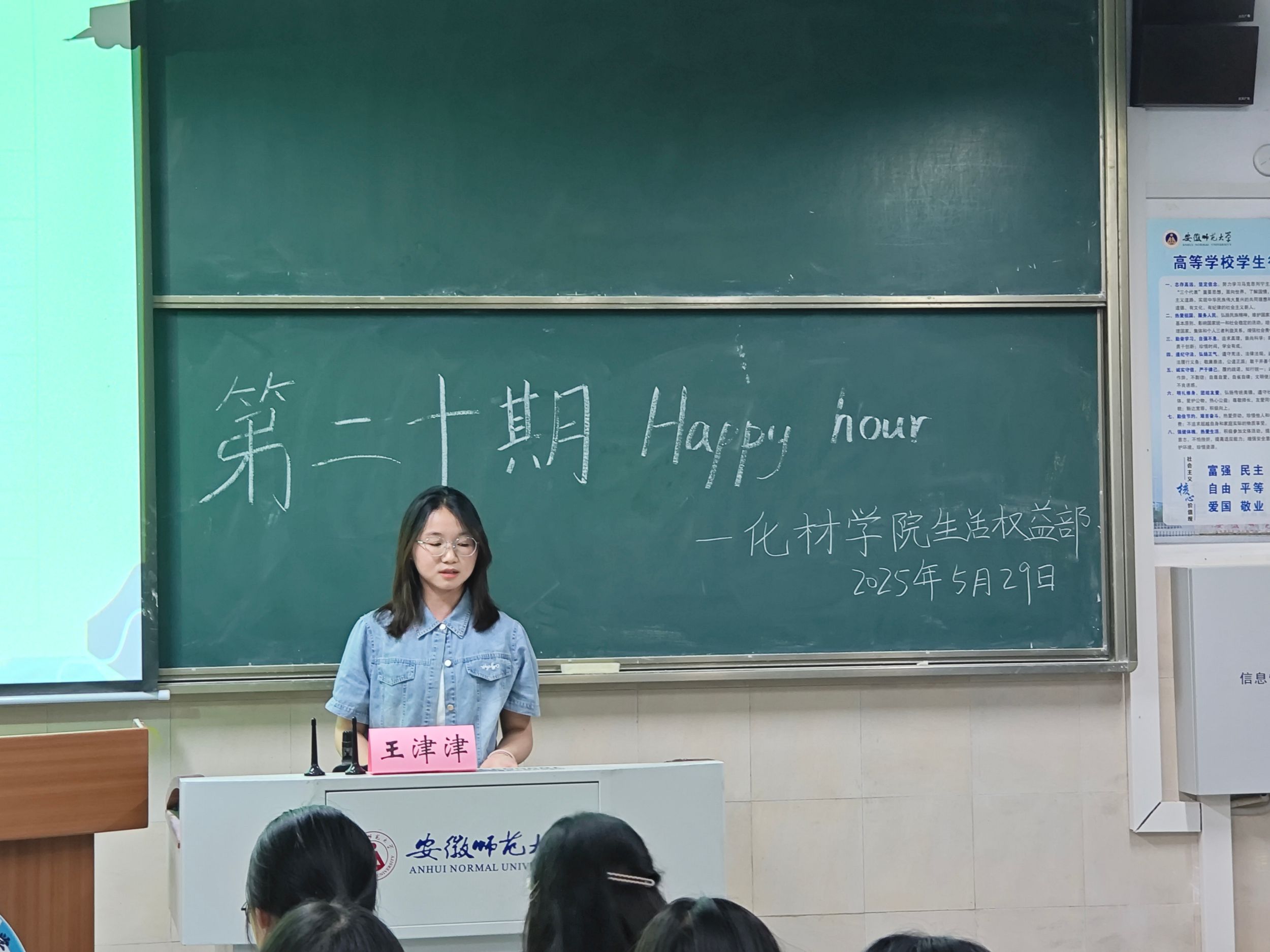 5月29日晚,第二十期Happy Hour——化语茶室特色活动如期开展。活动中,22级应用化学专业王津津和22级化学师范专业杜旻展结合专业知识,从自身经历出发,讲述了师范生和非师范生分别在教资备考过程中的注意事项和具体建议。互动环节中,同学们踊跃提问,宣讲人耐心解答,现场不时响起热烈的掌声。这场兼具专业性与亲和力的宣讲,让同学们在聆听与交流中汲取心理成长的力量,进一步提升了心理健康素养。