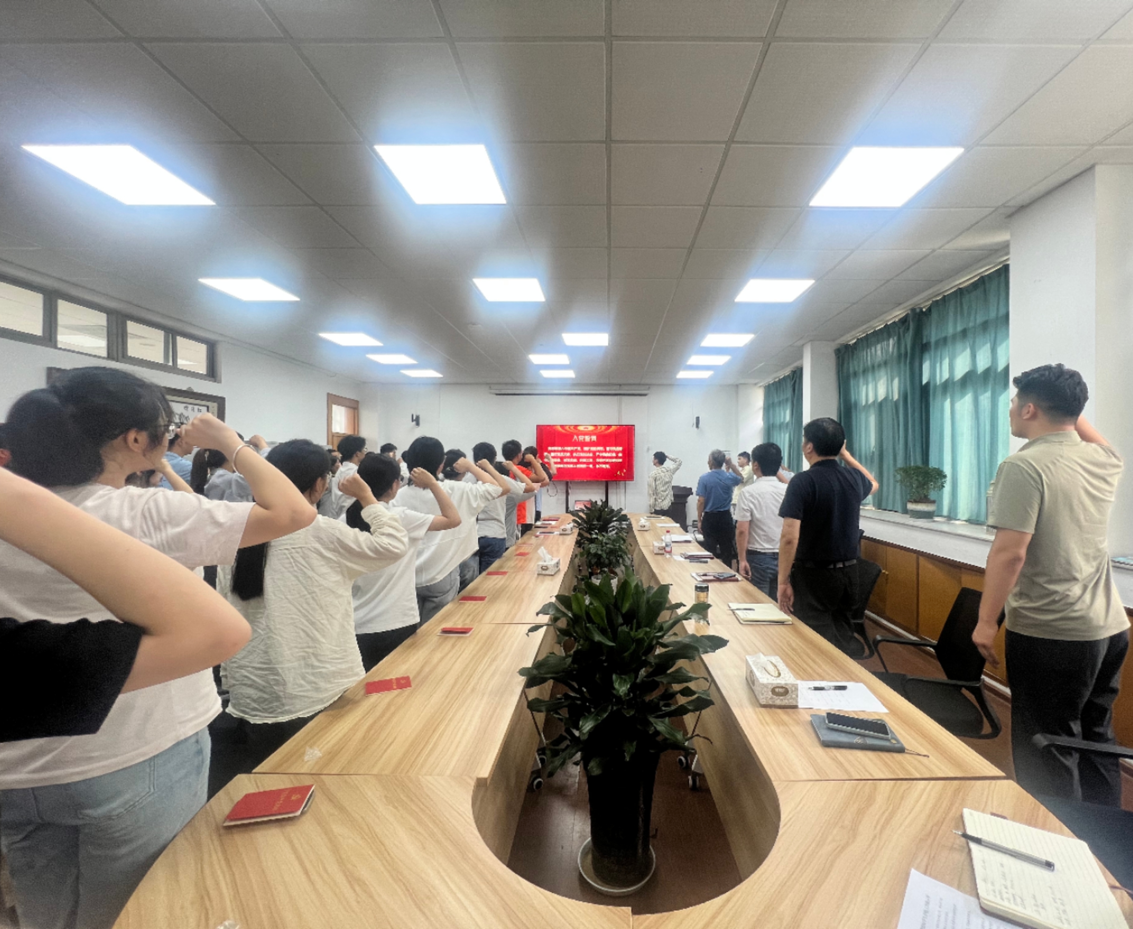 党委委员、支部书记为新发展的党员发放《中国共产党章程》、佩戴徽章,与会党员共同进行入党宣誓。全体党员握拳过肩,面向鲜红的党旗,在领誓人的带领下,庄严宣誓。党员们情绪饱满,字字铿锵,在激昂的宣誓声中进一步强化了对党忠诚、全心全意为人民服务的使命意识。梁齐军对新发展党员表示祝贺,希望大家坚定理想信念,牢记入党誓词和共产党员的初心使命;希望大家不断提升自身的政治素质和党性修养,坚持用习近平新时代中国特色社会主义思想武装头脑,在自我革命中永葆先进本色;希望大家珍惜党员身份,严于律己,用实际行动去践行入党誓词,为中华民族伟大复兴贡献青春之力。