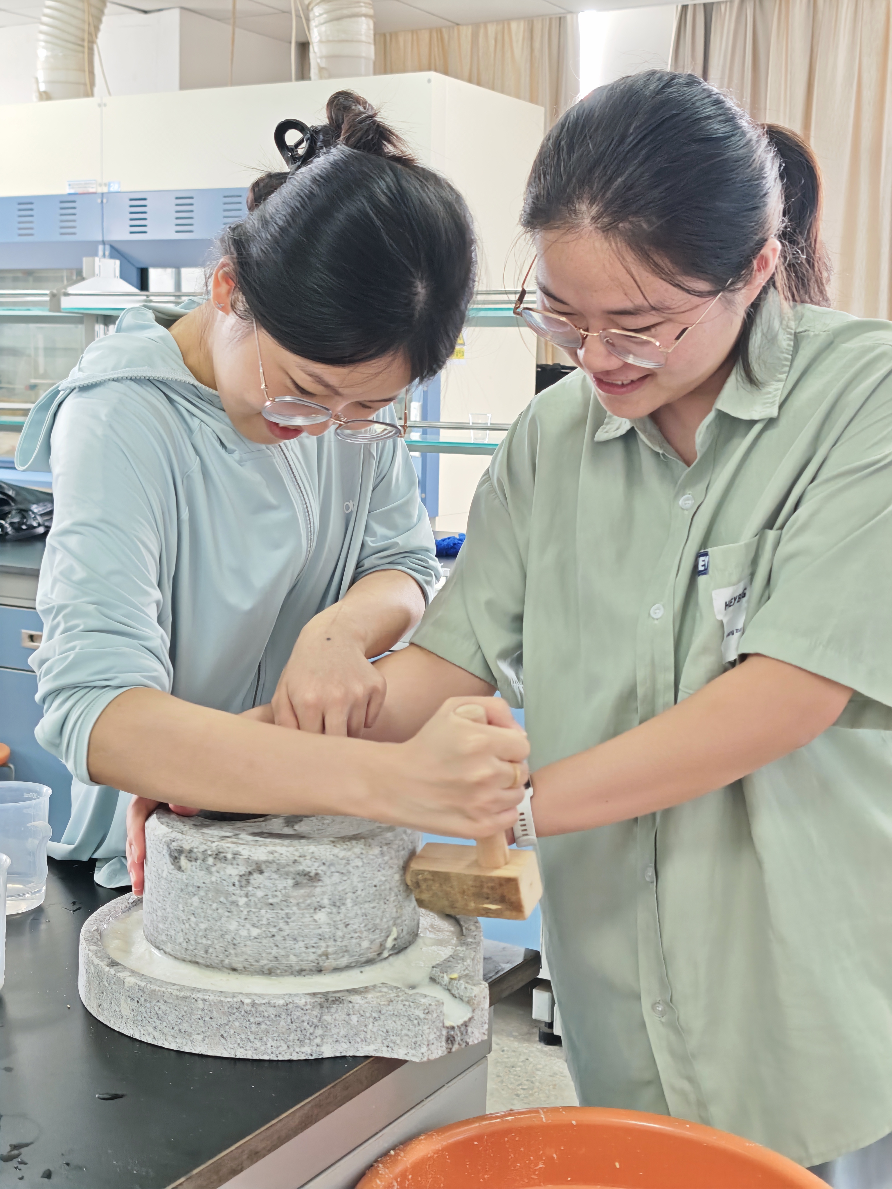 9 月 7 日上午则聚焦 “豆腐里的化学密码”,将探索推向深入。志愿者铺垫完豆腐的历史文化背景后,抛出 “豆浆都是胶体吗?”“蛋白质变性如何影响口感?”“凝固剂作用原理是什么?” 等问题,引导大学生开启 “科研式体验”。学生们分组设计对照实验,有的探究石膏、内酯、卤水三种凝固剂对豆腐质地的影响,有的分析煮浆温度与时间对成品口感的作用,还有的调整豆水比例以观察其与豆腐硬度的关联。