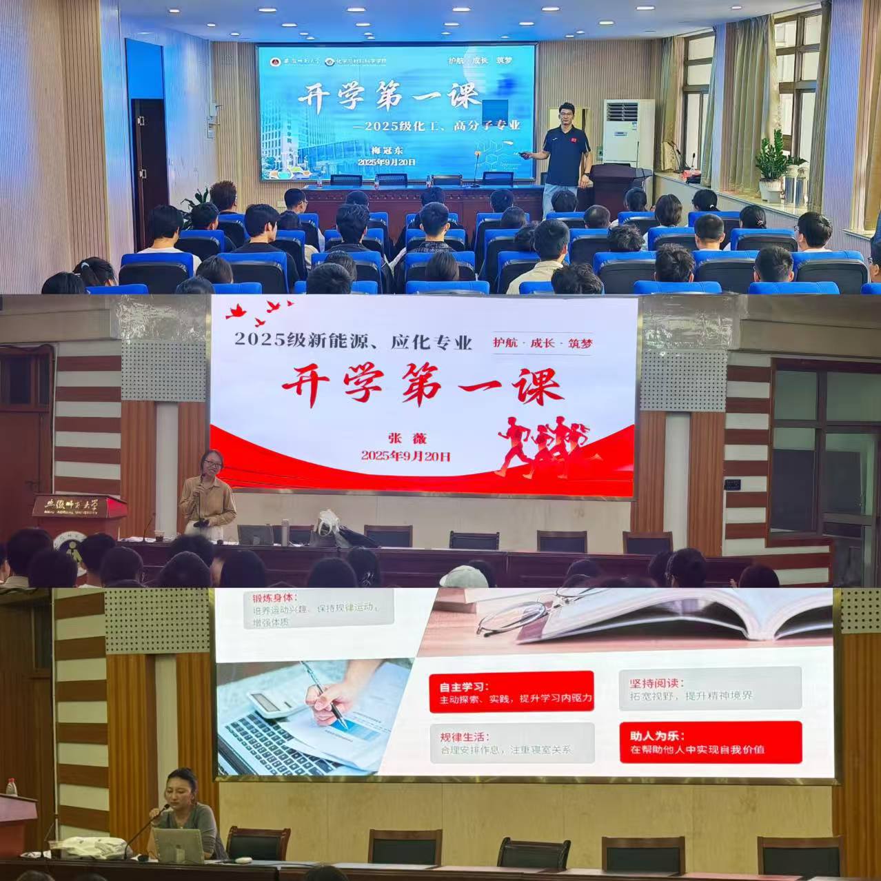 当晚,各专业辅导员围绕“开学第一课”主题,组织召开新生班会。班会中,辅导员从校园规章制度、学业规划、心理健康、安全防范等方面展开讲解,引导新生明确大学学习目标,树立正确的价值观;同时,通过互动交流环节,让新生们自我介绍、分享入学感受,帮助他们快速熟悉彼此,为后续的学习生活营造良好氛围。“开学第一课让我对大学生活有了更清晰的认识,也知道了接下来该如何规划自己的学习和生活。”化学师范专业的新生张同学说道。
