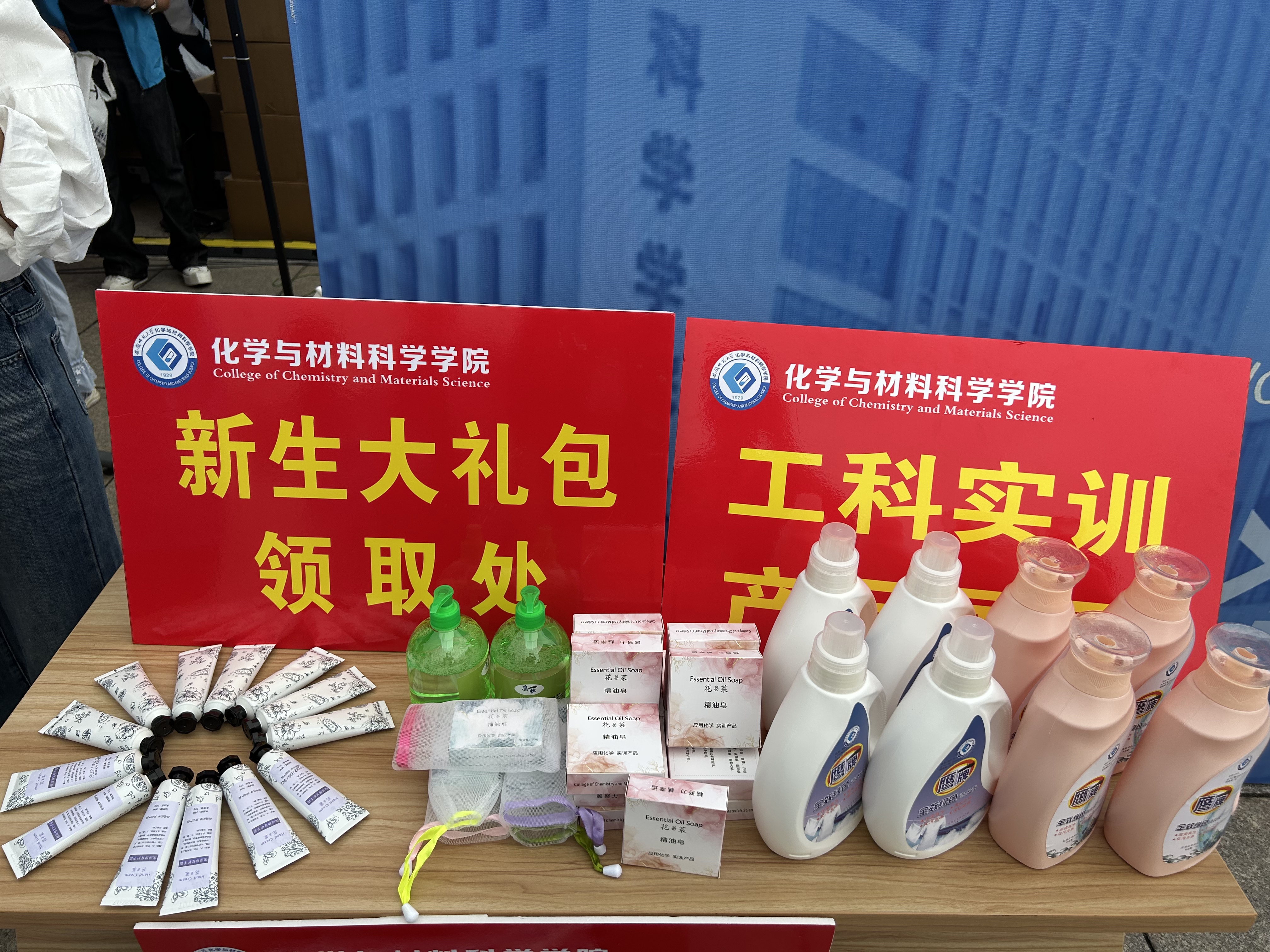 logo的帆布袋内,不仅装着由高年级学生参与实习实训制作的洗手液、洗衣液、护手霜等实用物资,还贴心配备了彩色卡套、实验服等学习生活必备品,让新生在感受绿帽奴