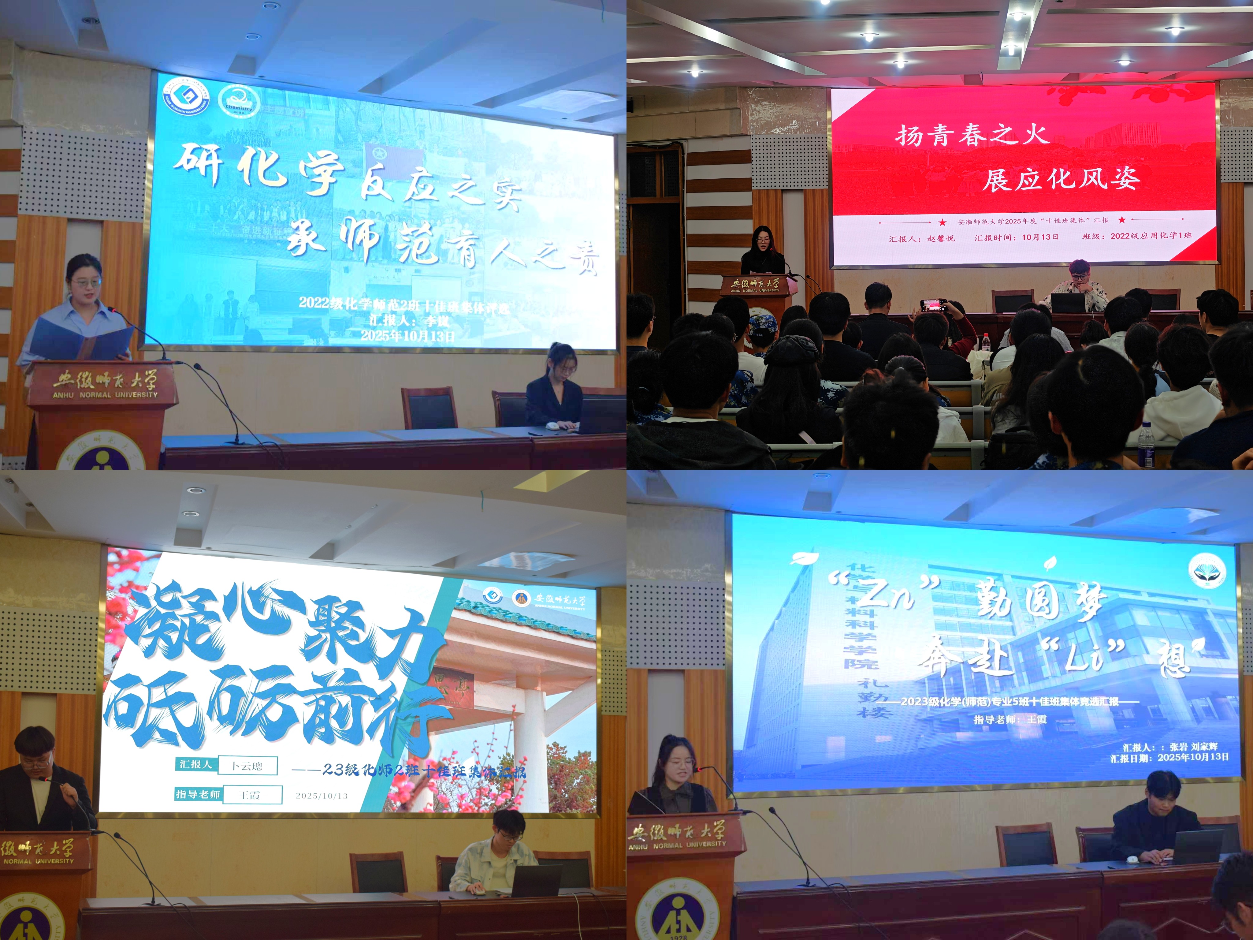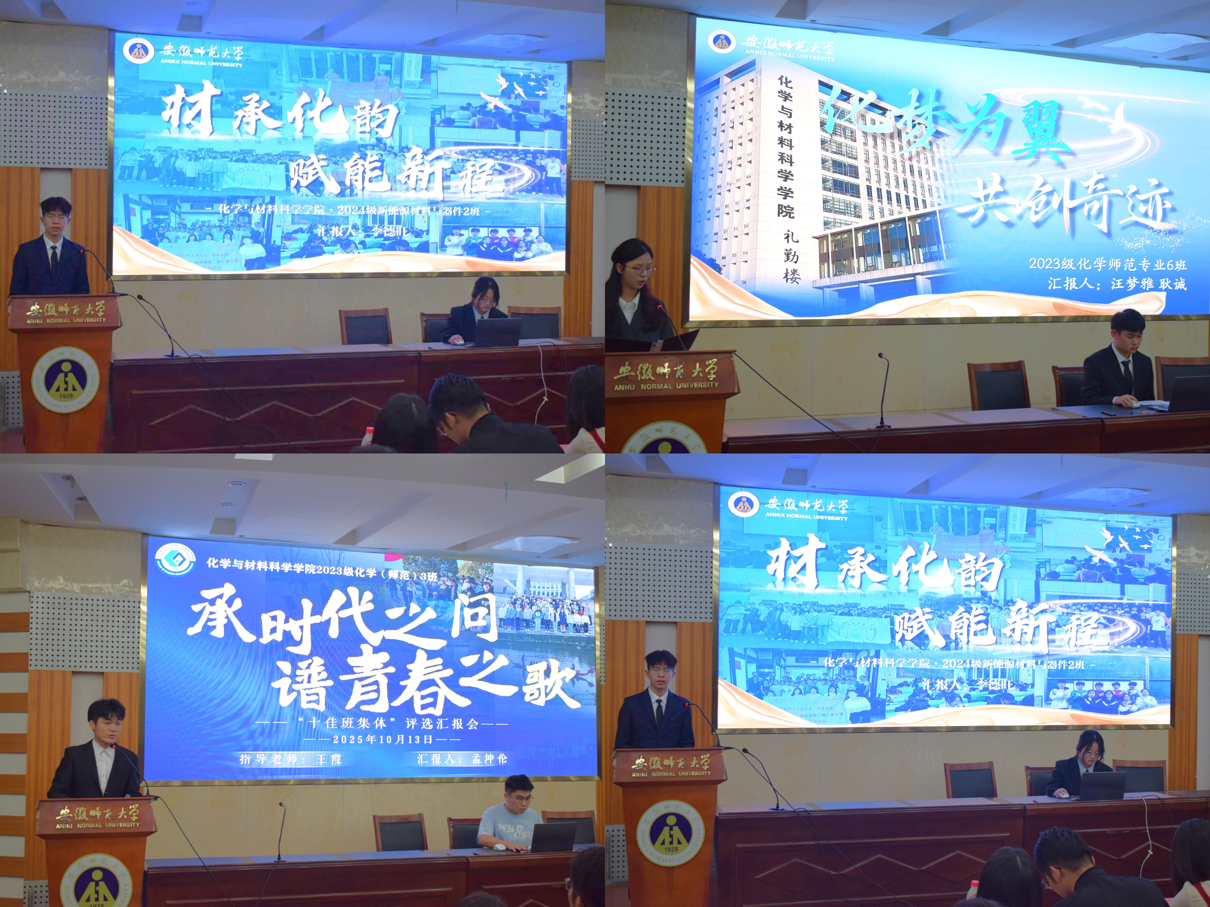 “十佳班集体”评选共有18个参评班级现场汇报。2024级化学(师范)5班、新能源材料与器件1班等,着重展示了他们从入学至今的快速融入与成长,通过一系列破冰活动、学习小组和主题团日,迅速凝聚起强大的班级向心力。2023级新能源材料与器件2班、应用化学2班的同学们分享了在实验室和项目竞赛中的探索与收获,体现了化材学子扎实的学术功底与创新意识。2022级化学(师范)2班、化学工程与工艺2班等班级,则系统梳理了过往三年的积累,并对未来的升学就业规划进行了展望,为学弟学妹们提供了宝贵的经验。各班级的演讲十分精彩,每一段文字、每一张图片,体现化材学子对于良好班风建设追求。